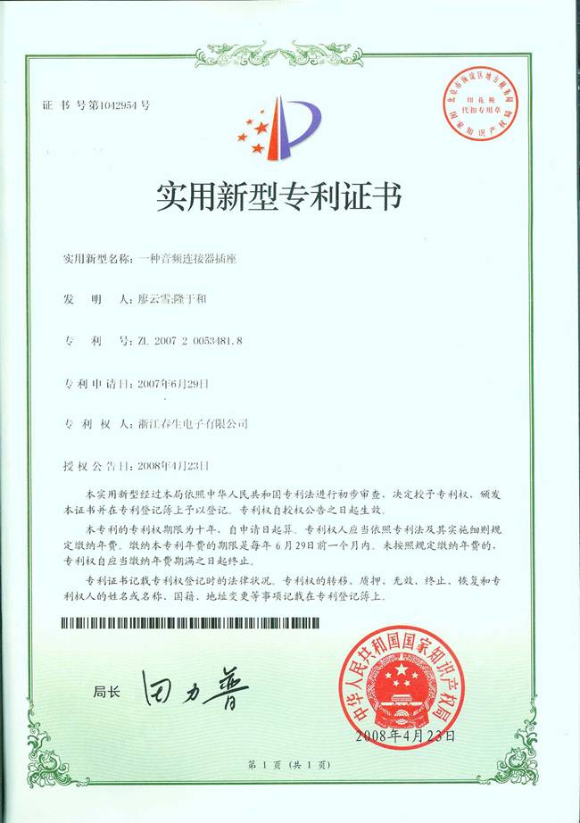 这种新型音频连接器插座解决了,原产品在组装时需须对圆针折弯,无法保证成品与印制电路板开孔的配合精度问题。广受下游生产商好评,经公司总经理办公会议评估,决定将此款新型产品申请专利。2007年6月29日,我司正式向国家知识产权局递交了专利申请。